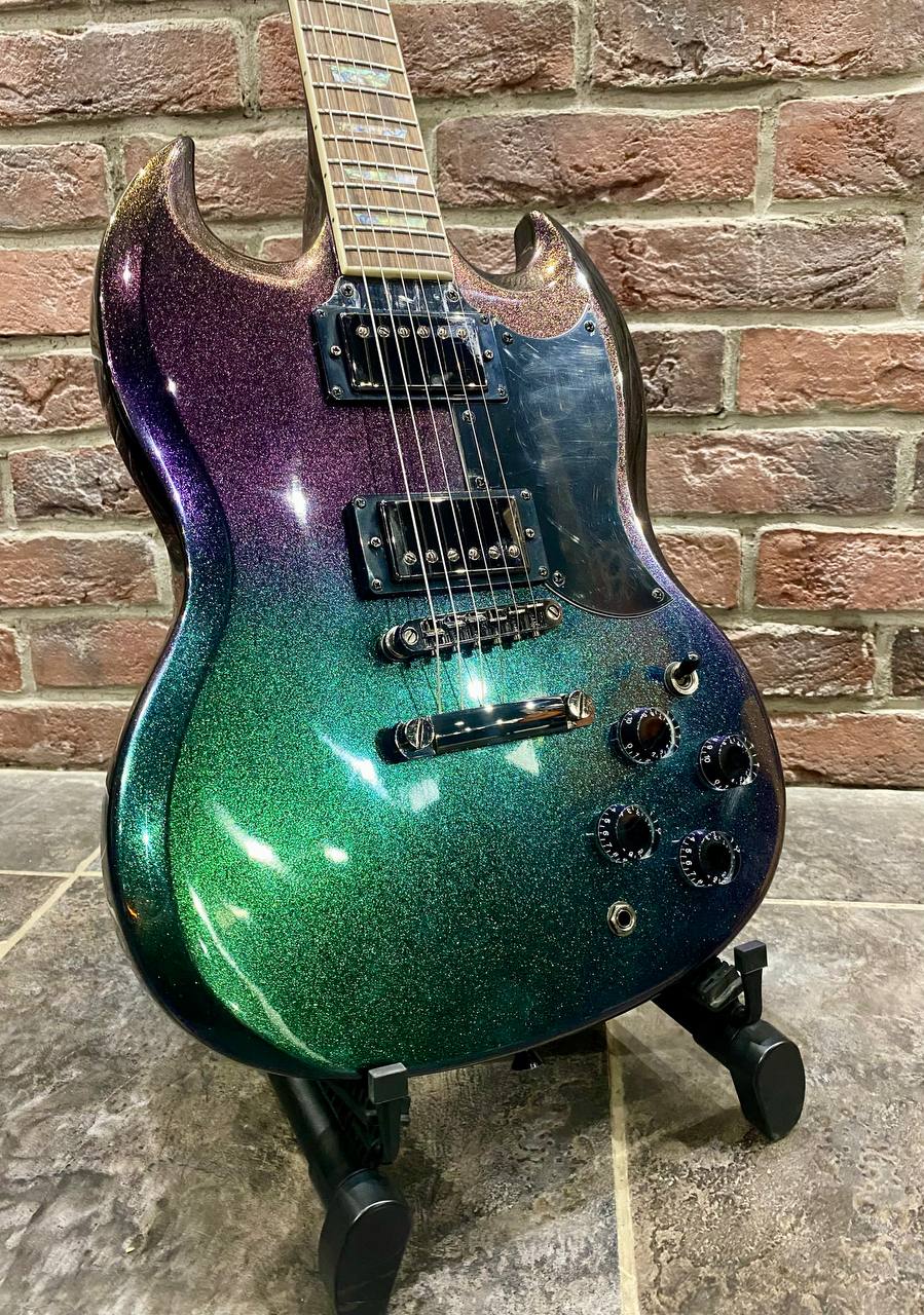 К Вашему внимаю представляем новинку на нашем рынке формы Viреr (SG), цвет фиолетово-зеленый хамелеон. Лично поиграл на этой новинке, гитара шикарна во всем, от удержания строя до весьма агрессивного саунда. Ровный вкленный гриф , чистый клин, агрессивный перезр...